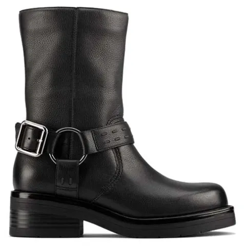 Smart Rebelle Up støvle i biker-look med en overdel af glat læder dekoreret med en ankelrem med pyntespænde og O-ring på ydersiden af anklen. Støvlen lukkes med en lynlås på indersiden af anklen. Den udtagelige indersål er polstret og åndbar, og den kraftige ydersål er stødabsorberende med et godt vejgreb. Ydersålen er skåret lige over foran snuden, hvilket giver støvlen en smart detalje, og den 5 cm høje blokhæl er reelt kun 3 cm med den 2 cm høje plateausål under forfoden.