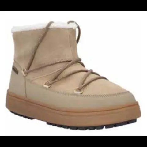 Superlækker Kayla WMN snowboot fra CMP. Overdelen er af ruskind med slidstærke syntetdetaljer på slidfladerne. Støvlen er en slip-on-model med pyntesnørebånd, som delvis lader sig justere over forfoden. En trækfane på hælen gør det nemt at træde i støvlen, som er vandtæt med en Clima Protect Waterproof-membran. Støvlen har et lunt fleecefoer og i skaftet et varmt loddent foer, der ses i åbningen som en smart detalje. Den udtagelige indersål er komfortabel, og ydersålen af EVA og gummi sikrer dig et godt fodfæste.