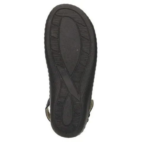 Fin sandal med to velcroremme over forfod og vrist samt en rem med spænde om hælen. Den ene side af overdelen har et blåt mønster. Den udtagelige dæksål er af skind, og den fleksible ydersål giver en god bevægelighed.