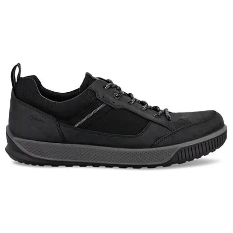 Flot Byway Tred sko med en robust overdel af olieret nubuck og åndbart tekstil. Skoen lukkes med snørebånd, og en trækfane på hælen gør det nemt at træde i skoen. Åbningen er polstret for øget komfort, og med GORE-TEX-membran får du vandtæt beskyttelse, som giver dig både åndbarhed og kompromisløs funktionalitet. Indvendigt har skoen et åndbart tekstilfoer, og den udtagelige indersål er polstret og komfortabel. ECCO FLUIDFORM™ sømløse konstruktion giver blød, fleksibel og fri bevægelse, imens den fleksible ydersål er stødabsorberende med et fint fodfæste.
