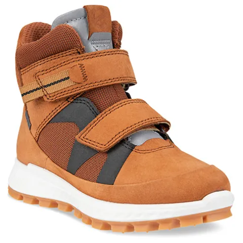 Smart og praktisk ECCO EXOSTRIKE KIDS støvle yder den nødvendige støtte i ujævnt og krævende terræn og beskytter fødderne og holder dem varme, mens du har det sjovt. Den hårdføre og langtidsholdbare overdel består af slidstærk ECCO nubuck og ruskind samt åndbart tekstil med refleksdetaljer på forfoden og pløsen. Støvlen justeres og lukkes med to velcroremme, som er nemme for små fingre at bruge. Skaftet er polstret for ekstra komfort og beskyttelse. GORE-TEX og et varmt syntetfoer gør støvlen vandtæt og lun, og den udtagelige, aluminiumsbelagte indersål isolerer mod kulden og hjælper med at holde fødderne varme. ECCO FLUIDFORM™ Direct Comfort-teknologi skaber en fleksibel og let mellemsål, der giver en finjusteret balance mellem stødabsorbering og komfort, samt en slidstærk, affjedrende gummiydersål med et groft mønster, der giver et godt fodfæste. Her får du en street-klar støvle konstrueret til udendørsaktiviteter i et sporty, cool look, som giver små fødder i voksealderen den nødvendige støtte og komfort.
