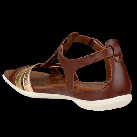 Lækker Flash sandal med en overdel af glat skind med tre remme over forfoden i farverne brun, guld og rødguld. Sandalen lukkes med en velcrorem om hælen. Den bløde dæksål beklædt med skind er komfortabel og åndbar, og den fleksible ydersål er stødabsorberende.