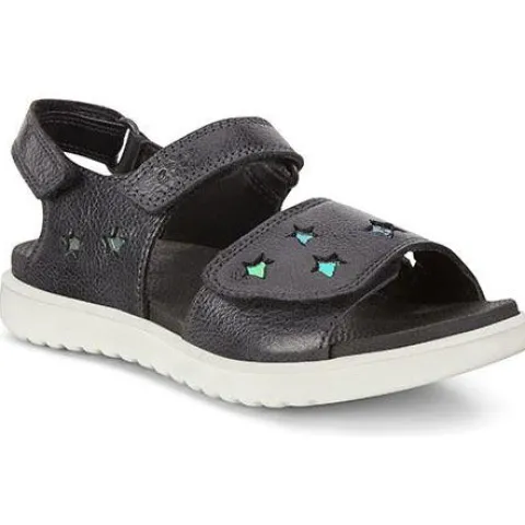 Super fin pigesandal fra ECCO med stjernedeko på overdelen. Overdel i blødt skind, der er designet til naturligt at tilpasse sig til foden. To velcroremme over foden og en bagom hælen, gør sandalen let at tage af og på. Ydersålen i ét stykke i PU er let og robust nok til udendørs leg. Skindforet giver ekstra polstring og støtte.