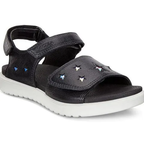 Super fin pigesandal fra ECCO med stjernedeko på overdelen. Overdel i blødt skind, der er designet til naturligt at tilpasse sig til foden. To velcroremme over foden og en bagom hælen, gør sandalen let at tage af og på. Ydersålen i ét stykke i PU er let og robust nok til udendørs leg. Skindforet giver ekstra polstring og støtte.