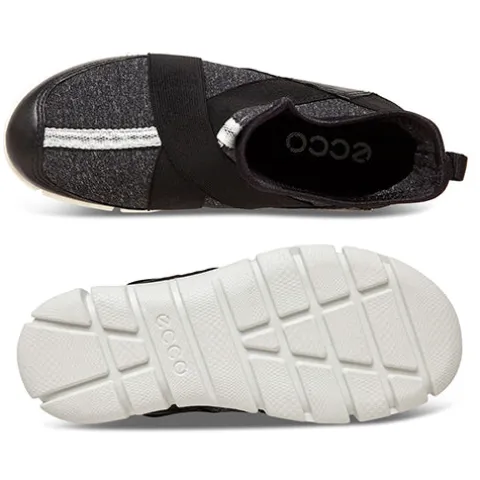 ECCO sko i et mix af blødt skind og mesh. De to brede elastikbånd holder godt på foden, og så er de nemme at smutte i. Super blød og lækker at have på foden, og så vejer den ikke særlig meget, på grund af de fleksible pu-såler.