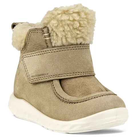 Små fødder har det lunt og rart i vinterhalvåret med den stilfulde ECCO SP.1 LITE INFANT støvle. Overdelen er af nubuck og ruskind med en kant af syntetisk plysfoer i åbningen. Støvlen lukkes med en bred velcrorem, og en trækfane bagpå gør det nemt at træde i støvlen. Den udtagelige indersål er blød, og det lune plysfoer samt ECCO Waterproof-teknologien sikrer lune, tørre fødder hele vinteren. ECCO FLUIDFORM™ giver en anatomisk pasform, som støtter foden, og ECCO SHOCK POINT-teknologi i sålen gør støvlen fjedrende, let og behagelig.