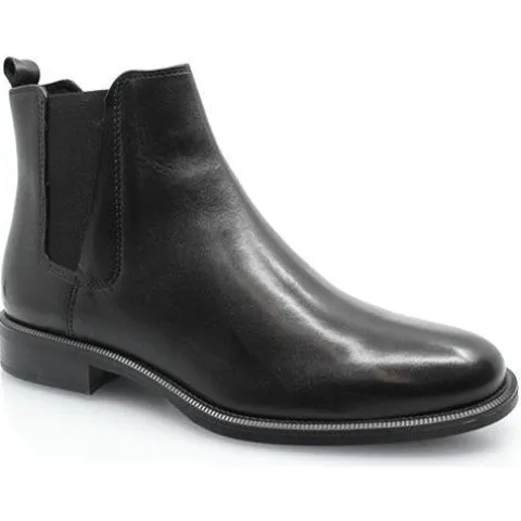 Flot chelseastøvle i glat sort skind. Støvlen er foret med tekstil og har elastik på begge sider af skaftet. Ydersålen er en let gummisål.