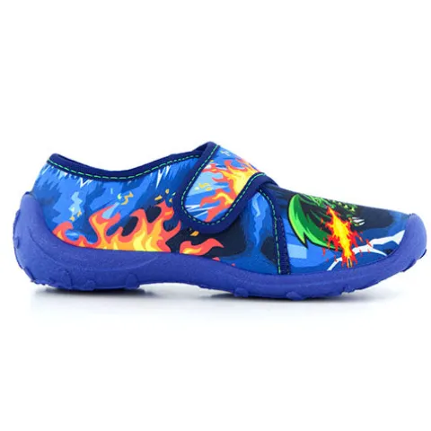 Superfed Boogy hjemmesko med en overdel af tekstil dekoreret med print af flammer og en drage, der spyr ild. Skoen lukkes med en velcrorem over vristen. Den fleksible ydersål giver et godt fodfæste.