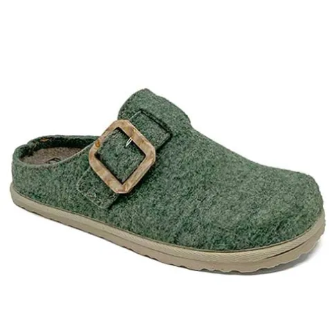 Lækker Katrin hjemmesko med en overdel af filt med en justerbar rem og plastspænde over vristen. Den udtagelige indersål er blød og komfortabel, og hælområdet er ekstra tykt, hvilket virker støddæmpende samt giver en let hælhøjde. Den fleksible ydersål er stødabsorberende med et fint fodfæste.