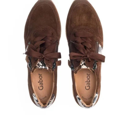 Super smart Gabor sko med dobbelt lynlås og snørebånd. Super fine detaljer med slangeprint på siden og bagpå hælen. Gabor skoen har god rummelighed omkring forfoden og indersålen kan tages ud. Indvendigt er der skindfoer og dæksålen er også i skind.