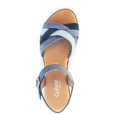 Lækker sandal med en overdel af ruskind i forskellige blå nuancer. Sandalen lukkes med en velcrorem med pyntespænde over vristen. Den polstrede dæksål er blød, og med vidde G er der ekstra plads om foden. Kilehælen understreger sandalens feminine look, og den fleksible gummiydersål er stødabsorberende og giver med sine riller et godt fodfæste. Fås i halve størrelser.