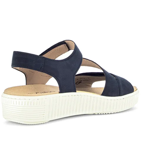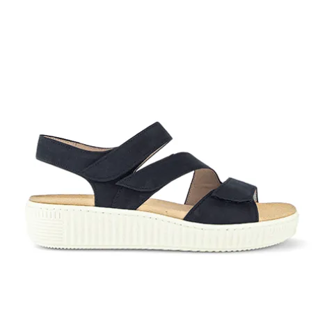 Dejlig sandal med en overdel af nubuck. Sandalen lukkes med tre velcroremme over forfoden og vristen. Sandalen har med Best Fitting en normal vidde plus et par ekstra millimeter i forfoden/trædefladen. Den udtagelige Optifit-indersål er komfortabel og kan vaskes ved maks. 30 grader, imens den fleksible, stødabsorberende ydersål giver et godt fodfæste. Kilehælen understreger det feminine look, og hælhøjden på 4 cm føles væsentligt lavere pga. den 2-2,5 cm høje plateausål under forfoden.