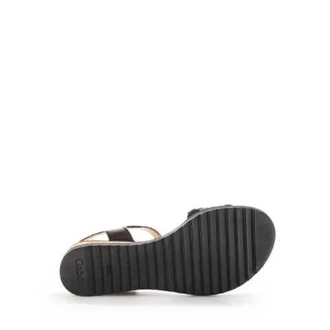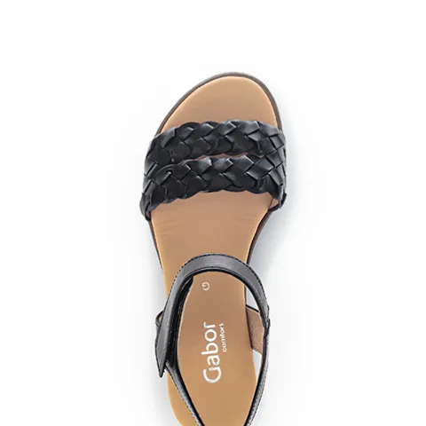 Dejlig sandal med en overdel af glat skind og over forfoden en bred rem af flettet skind. Sandalen lukkes med en velcrorem ved anklen. Dæksålen er beklædt med skind, og den fleksible ydersål med riller er stødabsorberende med et godt fodfæste. Den 4,5 cm høje hæl med kilehælen på 2,5 cm giver et feminint look.