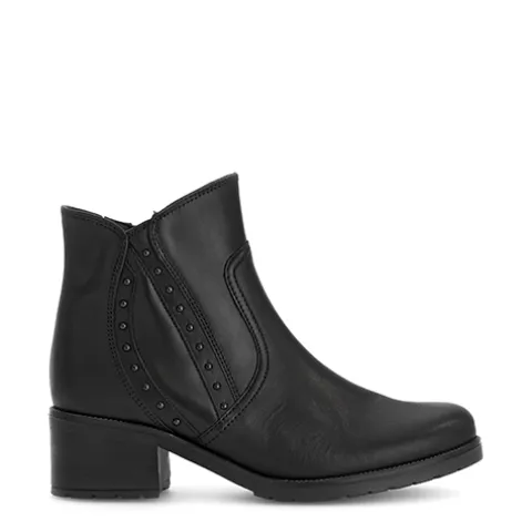Flot ankelstøvle med en overdel af glat skind dekoreret med diskrete nitter på ydersiden af anklen. Støvlen lukkes med en lynlås på indersiden af anklen, og en lille elastikkile giver en smule mere fleksibilitet om anklen. Med vidde G er der ekstra plads om forfoden. Indvendigt har støvlen et let, lunt foer, og den udtagelige indersål er blød. Den 5 cm høje blokhæl understreger det feminine og føles ikke så høj med en plateauhøjde under forfoden på 1,5 cm. Ydersålen er fleksibel og stødabsorberende med et godt fodfæste. Fås i halve størrelser.