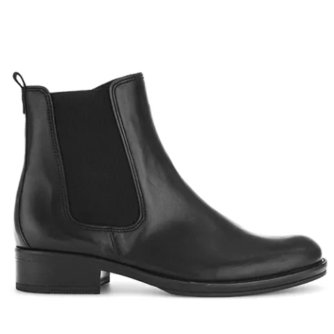 Fin ankelstøvle af glat skind. Lukkes med lynlås på indersiden af anklen, og et elastikpanel på ydersiden samt en trækfane bagpå gør det nemt at træde i støvlen. Støvlen har en lille hæl, der understreger det feminine look. Indersålen kan tages ud, og ydersålen giver et godt fodfæste.