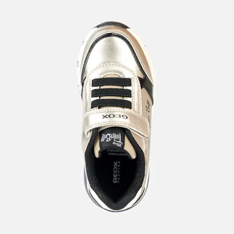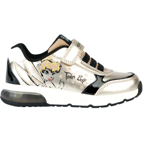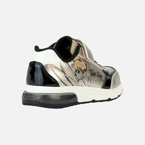 Smart J Spaceclub G.D Tinker Bell sko i en flot platinfarve dekoreret med sorte lakdetaljer på hæl og forfod og Tinker Bell og glitter på ydersiden af skoen. Tæt ved åbningen på den indvendige side af foden sidder en tænd-/slukknap til blink i hælen. Den bløde og lette overdel er af slidstærkt syntet med en pløs af åndbart tekstil, og både hæl og tå er forstærket for ekstra beskyttelse. Skoen lukkes med en velcrorem over vristen, og ikkejusterbart elastiksnørebånd sørger for en god tilpasning til foden. Skoen har en ergonomisk form, og åbningen er polstret for ekstra komfort. Den udtagelige indersål er åndbar og komfortabel, og gummiydersålen er stødabsorberende med et fint fodfæste.