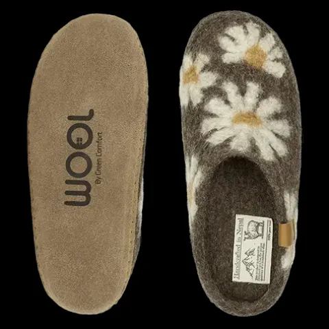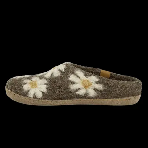 Superlækker Makalu hjemmesko af uldfilt håndlavet i Nepal. Overdelen er dekoreret med filtede margueritblomster, og en af skoene bærer initialet på den kvinde, der har skabt netop det par. Hjemmeskoen er meget fleksibel, og med en integreret EnergySole er den også komfortabel. Ydersålen består af ruskind.