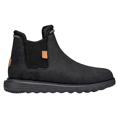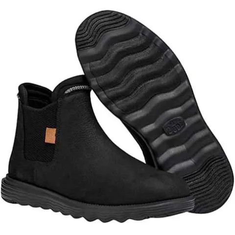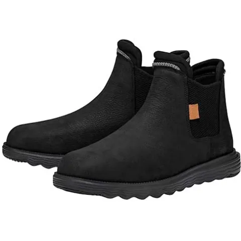 Lækker Branson M Chelsea-støvle med en vandafvisende overdel af nubuck med elastikpaneler på inder- og ydersiden af anklen samt et HeyDude-logo syet på hælen. Støvlen er en slip on-model med påsyede tekstilkanter i åbningen samt en elastiksnøre bagpå, der fungerer som trækfane, så støvlen er nemt at træde i. Den udtagelige indersål af skum er tyk, komfortabel og åndbar, og den fleksible ydersål har gummibelægninger og er stødabsorberende med et fint fodfæste.