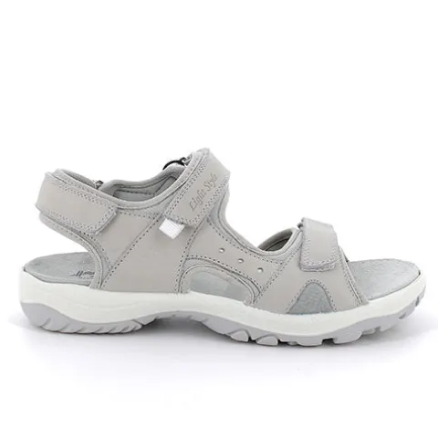 Lækker Light Style sandal med ekstra vidde. Overdelen er af nubuck foret med blødt tekstil, og sandalen lukkes med tre velcroremme (forfod, vrist og hæl). Den bløde dæksål er beklædt med ruskind, og den fleksible, stødabsorberende ydersål har et godt mønster, som giver et godt vejgreb.