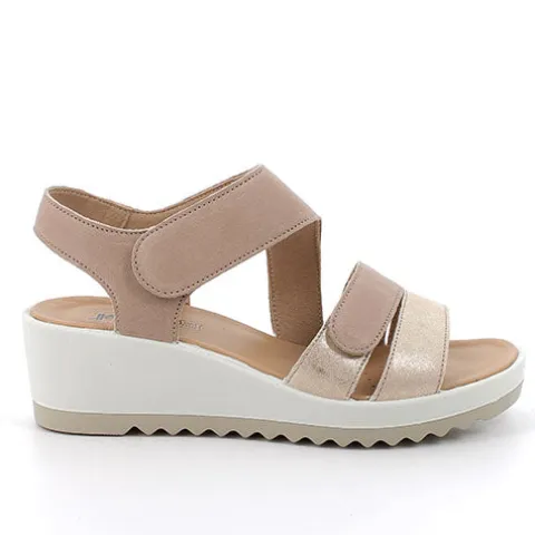 Lækker sandal med en overdel af glat skind. Lukkes med to velcroremme over forfod og vrist. Dæksålen er beklædt med skind og er komfortabel og åndbar. Du går hverken på kompromis med komforten eller det feminine look med den 5,5 cm høje kilehæl, for den føles som blot 3,5 cm pga. den 2 cm høje plateausål under forfoden. Den fleksible ydersål er stødabsorberende med et godt fodfæste.