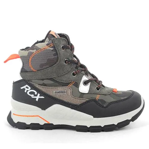 Super sej støvle fra Imac med camoflageprint på overdelen og orange detaljer. Støvlen er med tekstilsnøre foran og lynlås på indvendig side af skaftet. Støvlen er vandtæt og har et tynt fleecefoer indvendig.