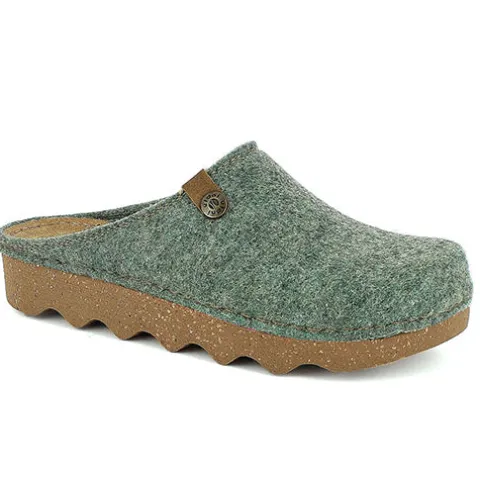 Lækker og fodformet slipper-hjemmesko med en overdel af filt, dekoreret med en kontrastfarvet syning om åbningen samt brun lap, foldet om åbningens kant, med metallogo. Dæksålen af skind er polstret og komfortabel, og den kraftige ydersål er støddæmpende og fleksibel og giver med sit mønster et fint fodfæste. Består delvis af genbrugsmaterialer. Lavet i Ukraine.