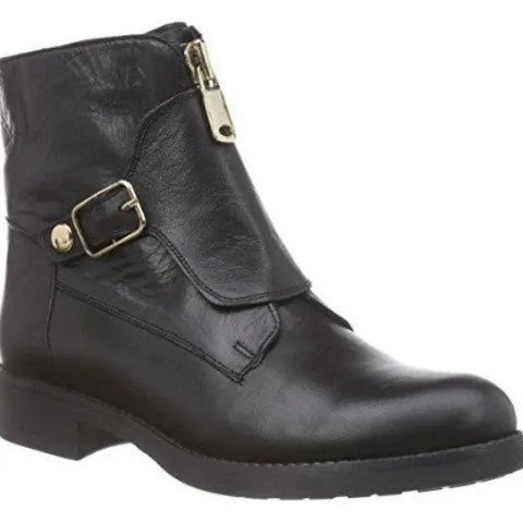 Læder støvle i blødt og lækkert skind. Støvlen har en indvendig guldlynlås og spænde og lynlås over foden. Dæksål i skind, og bløde, fleksible såler.