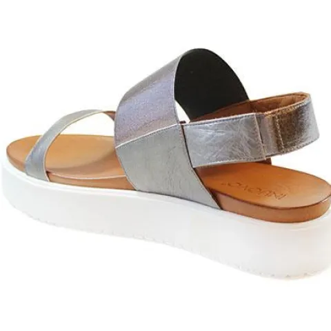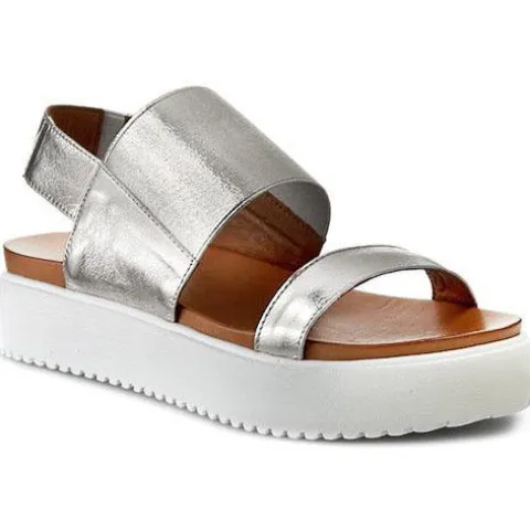 Smart og afslappet sandal fra Inuovo i lækkert metallisk skind. Elastikbånd over vrist og på bagrem. Sandalen har dæksål og for i skind. Hvid plateausål på 3 cm.