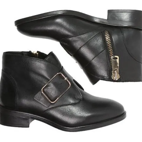 læder støvle med indvendig guldlynlås og spænde over foden. Dæksål i skind, og bløde, fleksible såler.