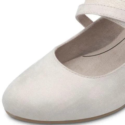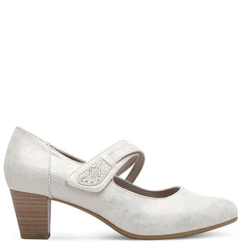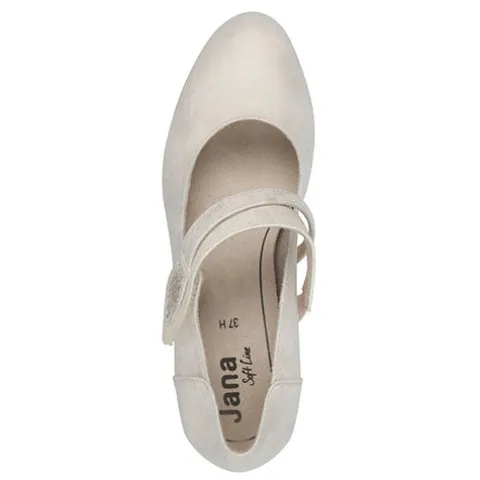 Flotte pumps fra Jane Soft Line-serien med en overdel af tekstil med metalprint. Skoen lukkes med en smart todelt velcrorem over vristen, dekoreret med glitrende sten. Den polstrede indersål er ekstra komfortabel, og med en vidde H-læst er der god plads til den bredere fod. Ydersålen under forfoden er af gummi og giver et godt fodfæste, og den robuste hæl med 5 cm højde har et flot trælook. 100 % vegansk.