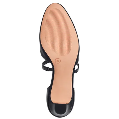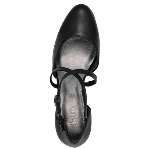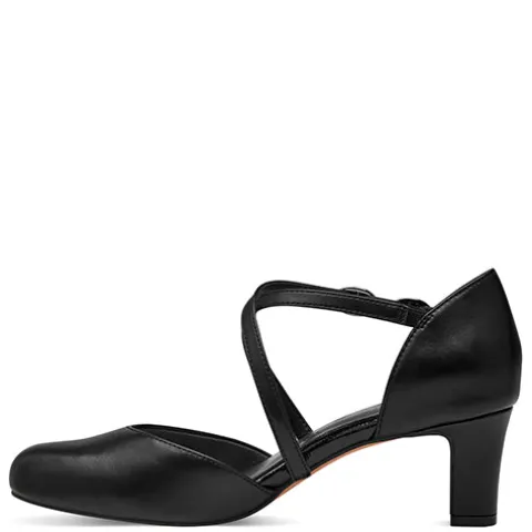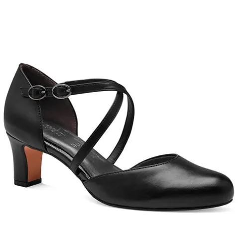 Flot damesko med lukket tå og hæl. Overdelen er af syntet i skindlook. Foden holdes på plads af to smalle remme, der krydser over vristen, og skoen lukkes med et spænde på den ene rem. Soft Line-indersålen er polstret og komfortabel, og den 6 cm høje hæl giver et feminint look. Skoen er 100 % vegansk.