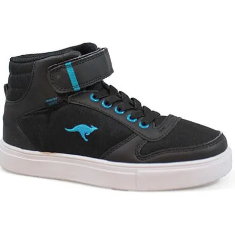 Basketstøvle fra KangaROOS. Fremstillet af åndbar nylon med forstærkninger af kunstskind. Modellen er med elastiksnøre og en velcrorem.