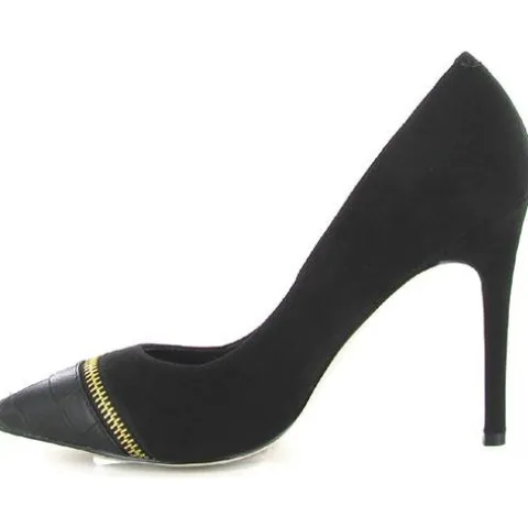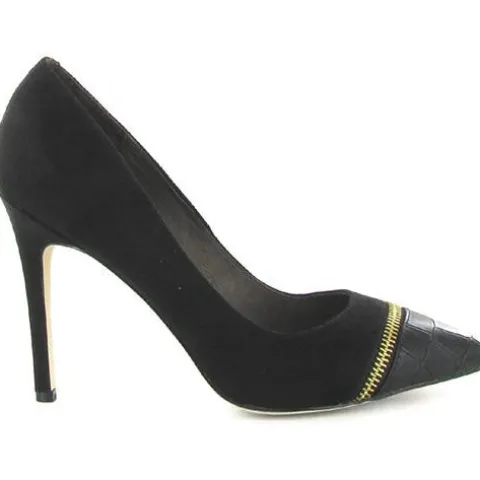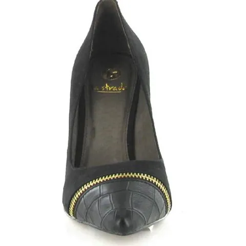 Supersej sko med lynlåsdetalje og præg foran på den tilspidsede snude. Indvendig i skoen er der skindfoer.