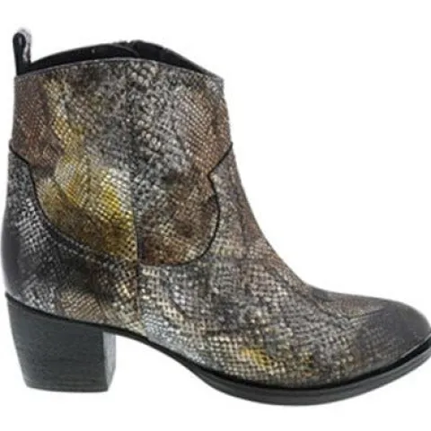 Lazamanistøvle i sølv, brun og gule nuancer i et metalisk skær. En fed støvle med fart på. Støvlen er med indvendig lynlås og tekstilfoer.