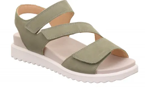 Lækker Move sandal med en overdel af støvgrøn nubuck. Sandalen lukkes med tre velcroremme over forfod og vrist, og dæksålen er blød og komfortabel. Den fleksible og stødabsorberende ydersål har kraftige riller og giver et godt fodfæste.