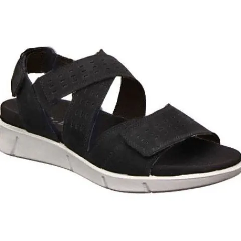 Komfortabel sandal fra Legero med bløde og fleksible såler. Indlægssålen kan tages ud ved behov. Sandalen har en perforeret overdel i nubuk. To justerbare velcroremme over tæer og bagom hælen. Krydsrem over vrist med isat elastik i begge ender.