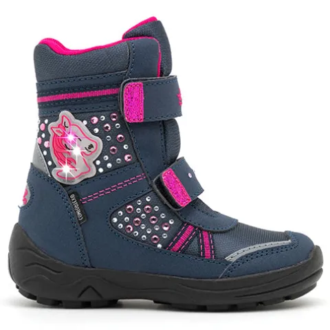 Varm og vandtæt støvle med velcro samt et motiv med hestehoved, som blinker.
