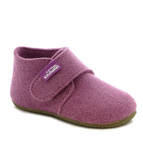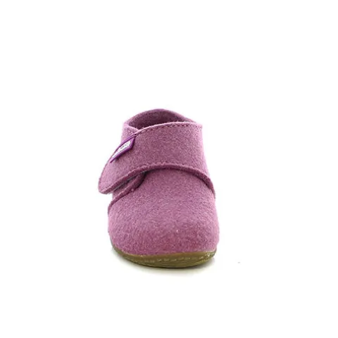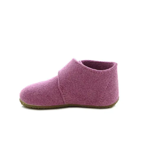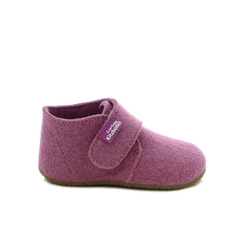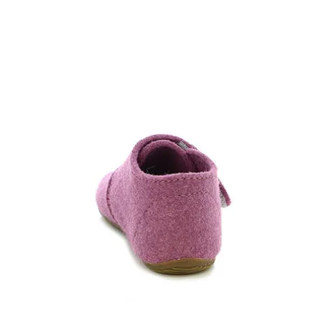 Velcro-hjemmesko til små piger. Overdelen er af filt med 90 % uld. En let gummisål beskytter små børns fødder under deres første opdagelsesrejser og giver et godt greb.