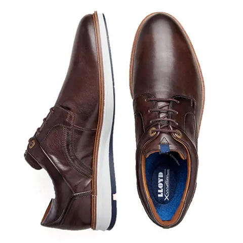 Lloyd sko med X-motion indlægssål, der har stødabsorbering og giver optimal støtte og skåner hele kroppens bevægelsesapparat. Super flot brun sko med lys ydersål for et lettere udtryk.