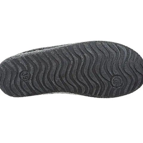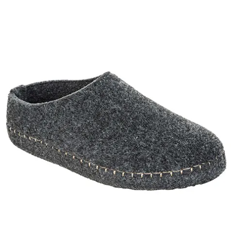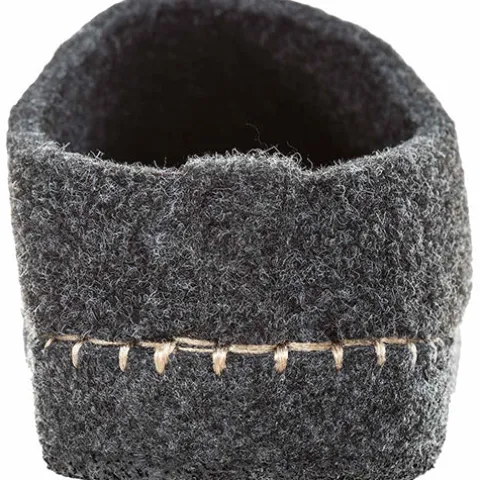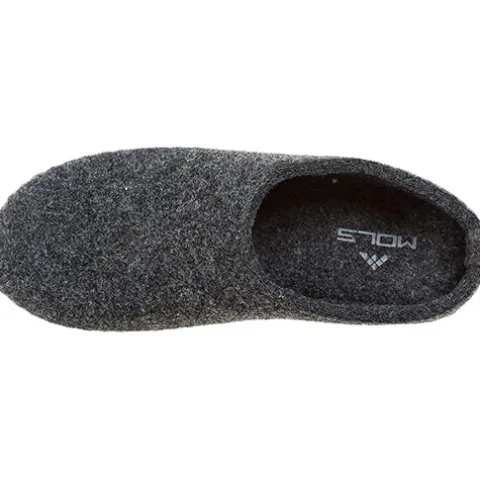 Bløde tøfler fra Mols med lyse stikninger rundet i sålkanten.
