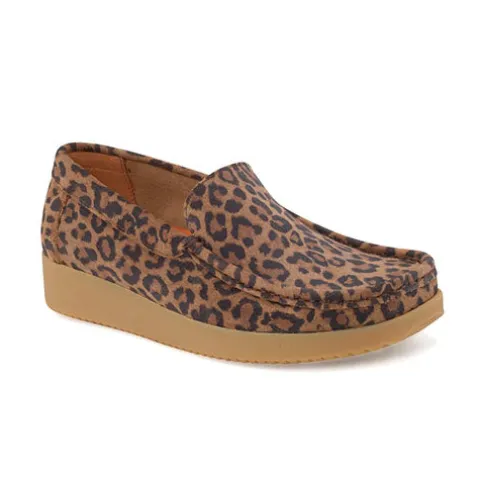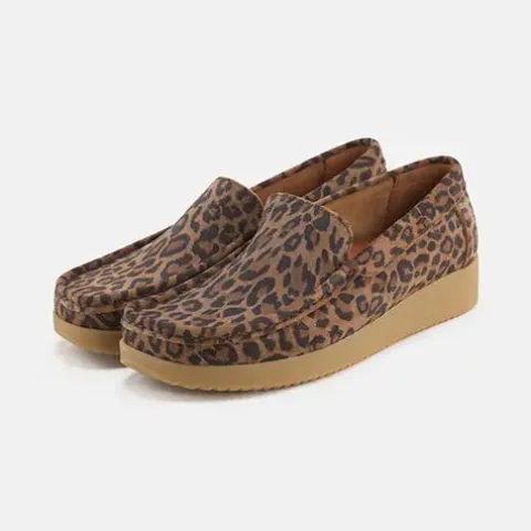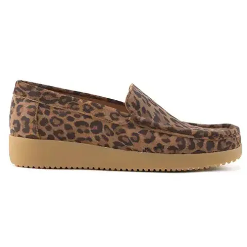 Lækker Elin loafer med en overdel af ruskind med leopardprint. Skoen er blød, fleksibel og komfortabel og har mokkasinsyning på forfoden. Indersålen er komfortabel, og ydersålen består af ergonomisk naturgummi med korkrester. Her får du et par loafers perfekt til både hverdag og fest.