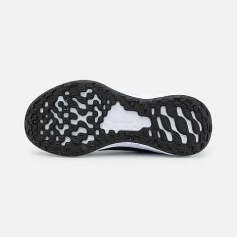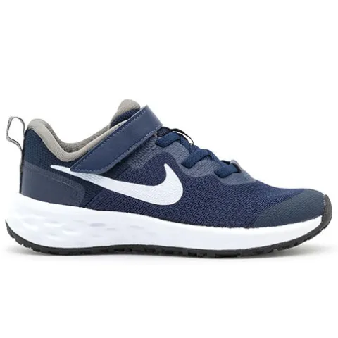 Sporty Revolution 6 sneaker fra Nike med smarte detaljer som hvidt Nike-logo på siderne og et mærke på pløsen. Skoen har elastiksnøre og lukkes med en velcrorem over vristen, og en trækfane på hælen gør det nemmere at træde i skoen. Tekstiloverdelen gør skoen åndbar. Skoen har en komfortabel indersål, og den polstrede åbning øger komforten. Ydersålen er fleksibel og giver et godt fodfæste.