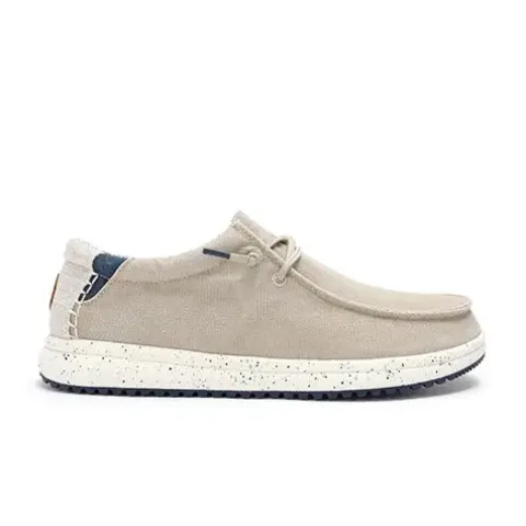 Lækker Wallabi Nias sko med en overdel af åndbart og slidstærkt bomuldskanvas (90 % bomuld/10 % hør) med en moc toe-syning. Skoen er en slip on-model med en elastisk snøre, som ikke skal bindes. Åbningen er polstret for øget komfort, og indvendig har skoen et blødt og smart bomuldsfoer. Den ekstrapolstrede og udtagelige EVA-indersål er beklædt med kork og giver ekstra støddæmpning og høj komfort hele dagen. Den fleksible EVA-ydersål med gummibelægning er stødabsorberende med et godt fodfæste. Her får du en lækker og let Wallabi-model, der er supernem at tage af og på, og som holder dig cool hele sæsonen.