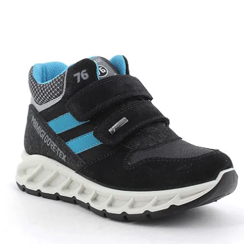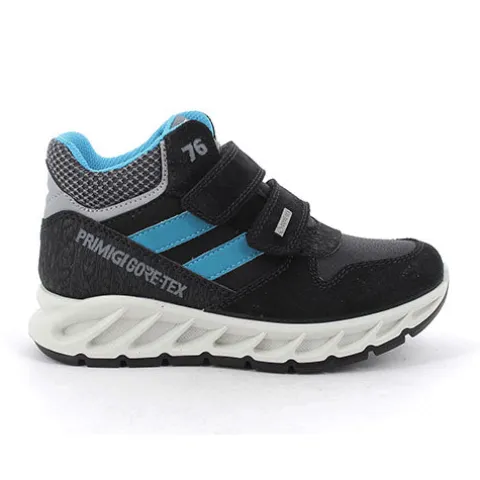 Kort Primigi støvle med åndbar og vandtæt Gore-TEX-membran. Støvlen er tekstilforet og har to velcroremme over foden.