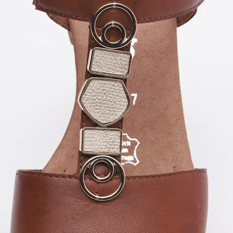 Smart og feminin skindsandal dekoreret med guldornamenter på vristen. Sandalen lukkes med en velcrorem over vristen.