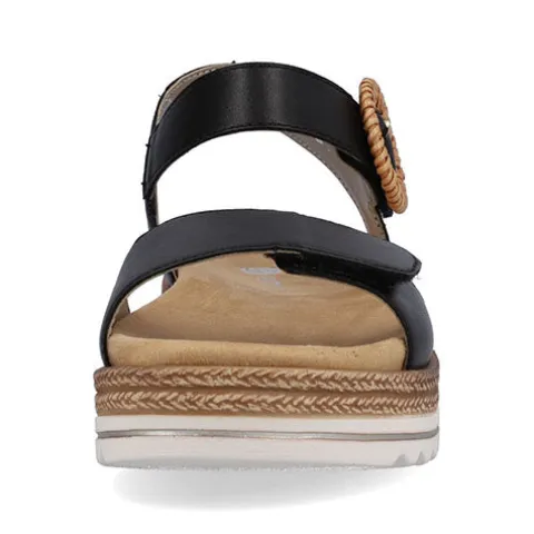 Smart og komfortabel sandal fra Remonte med en overdel af glat skind. Lukkes med to velcroremme over henholdsvis forfod og vrist, sidstnævnte har et rundt pyntespænde i flet. Den bløde, tekstilbeklædte Soft-indersål kan tages ud. Den lette og fleksible ydersål er stødabsorberende med et godt fodfæste. Den 4,5 cm høje kilehæl føles som blot 2 cm pga. den 3 cm høje plateausål under forfoden.