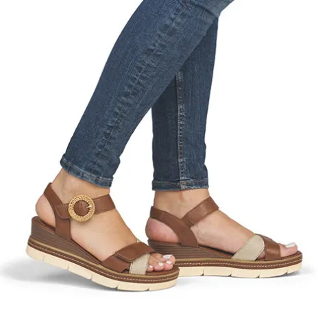 Feminin sandal til sommerdage og lune festaftener. Overdelen er af brunt glat skind samt en flot rem af beige syntet. Sandalen lukkes med to velcroremme (forfod og vrist), og vristremmen er dekoreret med et rundt pyntespænde med flet. Dæksålen har en blød skindbelægning, og den flotte kilehæl med en hælhøjde på 6 cm føles som 3,5 cm pga. plateauhøjden på 2,5 cm.