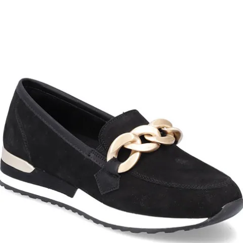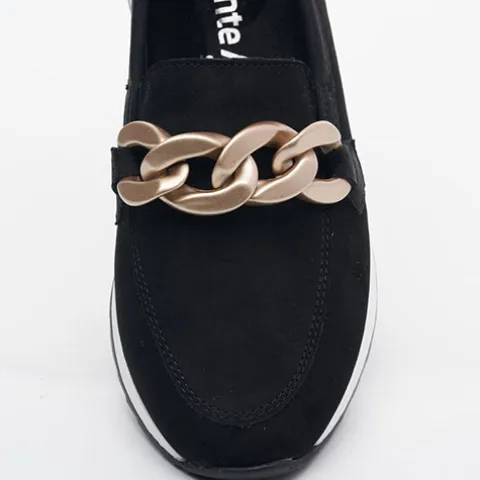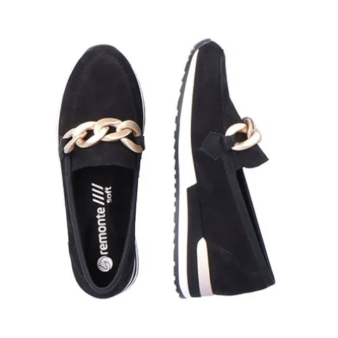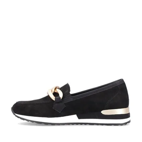 Lækker hyttesko/loafer med en overdel af blød nubuck, dekoreret med en guldfarvet kæde over vristen samt en detalje på hælen i en mat guldfarve. Mellemsålen er hvid. Elastikkiler på begge sider af åbningen gør det nemt at træde i skoen. Den ekstra rummelighed omkring forfoden øger komforten for den bredere fod, og den udtagelige remonte soft-indersål er superkomfortabel, da den er stødabsorberende, åndbar og godt polstret. Den fleksible gummiydersål har et godt mønster og giver et fint vejgreb. Her får du et par smarte loafers perfekt til en både afslappet og stilfuld hverdag.