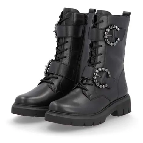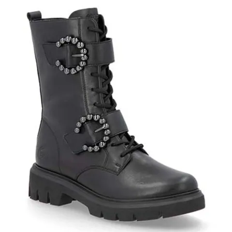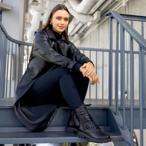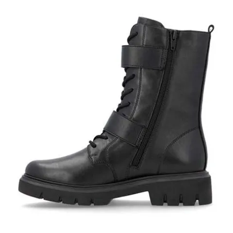 Let og smart støvle med en overdel af glat skind og syntet. Støvlen justeres med snørebånd og to velcroremme med runde pyntespænder af mørkt metal, og den lukkes med en lynlås på indersiden af anklen. En lille trækfane bagpå gør det nemt at træde i støvlen, som har et blødt fleecefoer. Med komfortvidde er der mere plads om forfoden. Indersålen er komfortabel, og den kraftige ydersål er stødabsorberende med et fint fodfæste.