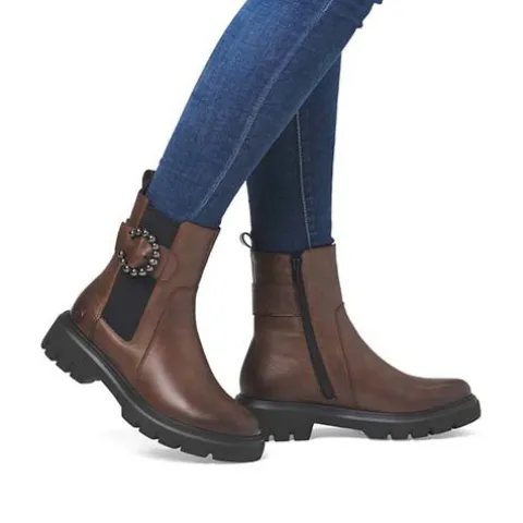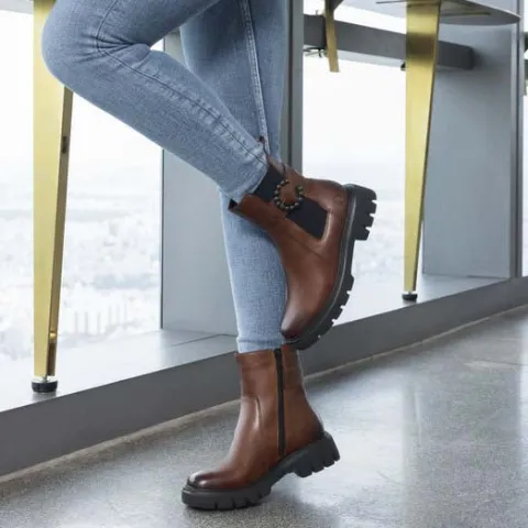 Lækker og let støvle perfekt til efteråret. Overdelen er af glat skind samt et elastikpanel på ydersiden af anklen dekoreret med en rem med et smart pyntespænde. Støvlen lukkes med en lynlås på indersiden af anklen, og en trækfane bagpå gør det nemmere at træde i støvlen. Komfortvidden giver lidt mere rummelighed om forfoden Indvendig har støvlen et let og lunt foer samt en udtagelig indersål beklædt med et lunt foer. Den kraftige ydersål er stødabsorberende med et godt fodfæste.